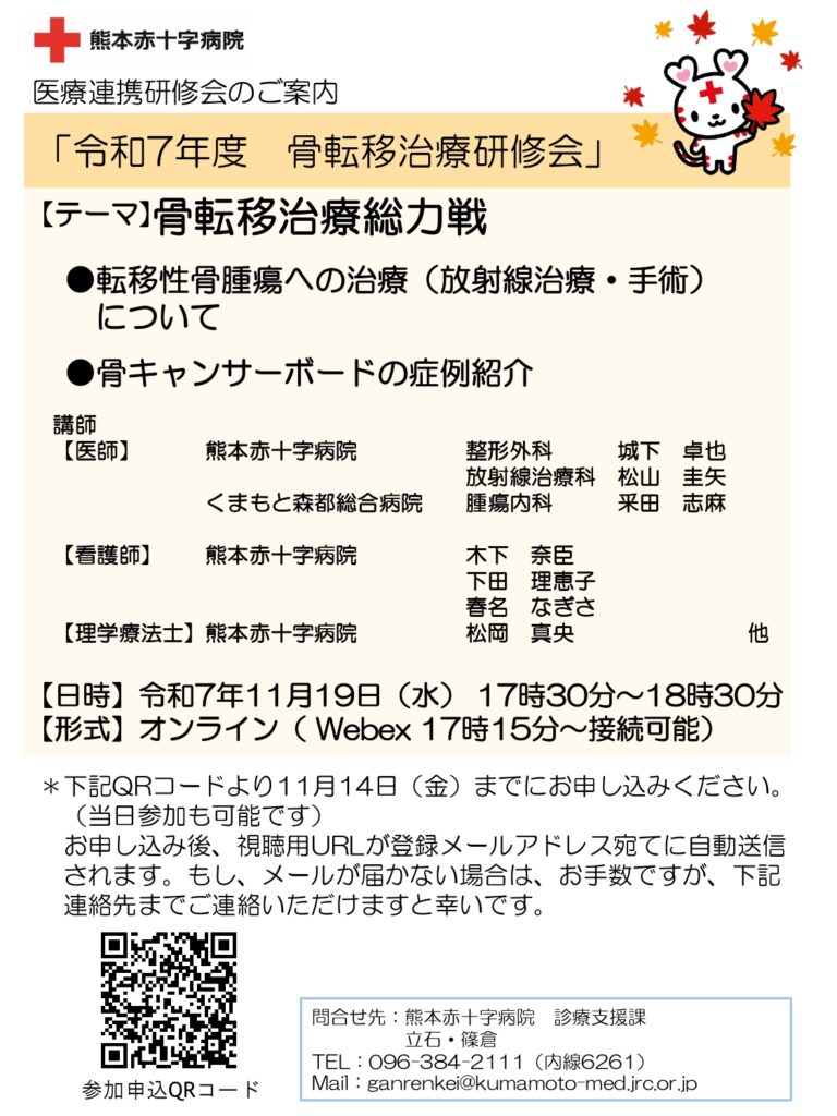令和7年11月19日(水)に医療従事者向けの「令和7年度骨転移治療研修会」を開催いたします。