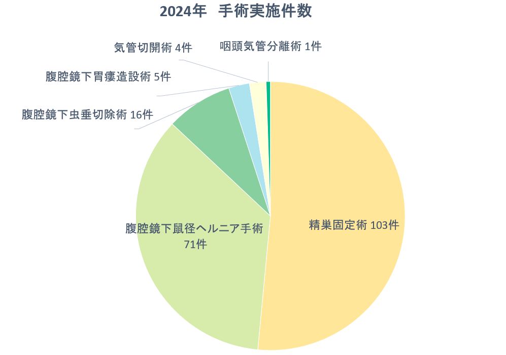 年間の手術数は100~140件程度、手術時間は30~60分程度です。腹腔鏡手術のキズは臍(5~6mm)、左腹部(3mm)、足の付け根(針の痕のみ)の3か所です。