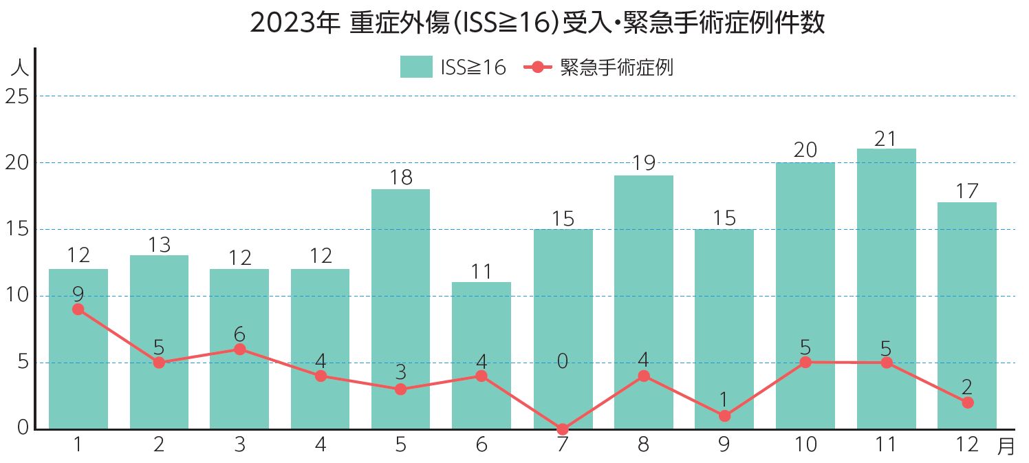 当院では、熊本県下の約1/3にあたる重症外傷患者の診療を担っています。これら多発外傷を含む重症外傷に対応すべく、高度な外傷蘇生を行って院内の外科、整形外科、脳神経外科などの外科系診療科と協働し、一連の流れでの外傷診療を行っています。このシームレスな外傷診療は、重症外傷患者の救命率向上に大きく貢献しており、高い救命率を維持しています。2020年4月からは、新たに「重症外傷センター」を設置し、病院前外傷診療から救急科と連携し外傷蘇生以降は集中治療科と協働することで、強化された外傷診療体制をセンター内に構築できたことにより、更なる救命率向上を図っていきます。
