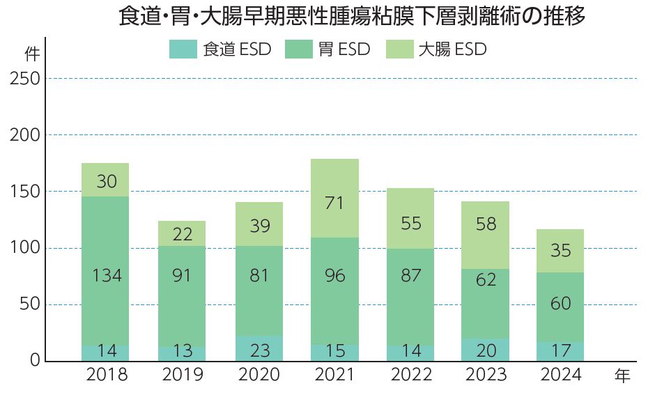 内視鏡検査で早期精密に発見し、内視鏡治療や腹腔鏡で切除できる体制を外科と協力しながら推進しています。