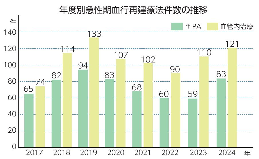 脳梗塞を中心にけいれん、脳炎など神経系の救急疾患に地域の基幹病院として24時間体制で対応していることが熊本赤十字病院脳神経内科の特徴です。入院症例の8割が脳梗塞の患者さんです。実績参照。とくに急性期脳梗塞に対して閉塞血管をカテーテルを使って再開通させる脳血管内治療(血栓回収治療)に注力しており、国内でも有数の施行数です。脳血管内治療とt-PA治療を駆使することで、劇的な改善を示す患者さんも多くおられます。実績参照。近年、迅速で適切な治療適応決定のため、CT還流画像自動解析システム(RAPID)を導入しました。