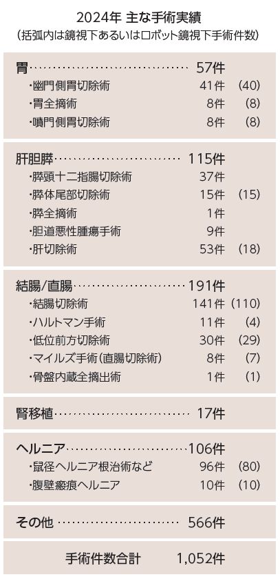 鼠径・大腿・閉鎖孔ヘルニア、腹壁・臍ヘルニアなどの各種ヘルニアや胆のう結石症に対する手術を行っており、ほとんどの症例を鏡視下手術で行っています。