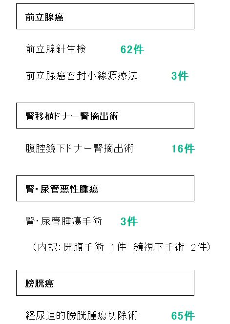 最近では、局所浸潤がんでも外照射やホルモン療法の併用により、手術に比べ有効性が高いとの報告もあります。 また、腹腔鏡技術認定医が在籍しており、腎細胞がんや上部尿路腫瘍、腎移植のドナー腎摘出術では鏡視下手術も取り入れて、早期腎細胞がんの部分切除など治療効果を低下させない範囲で、機能温存と低侵襲を目指しています。
