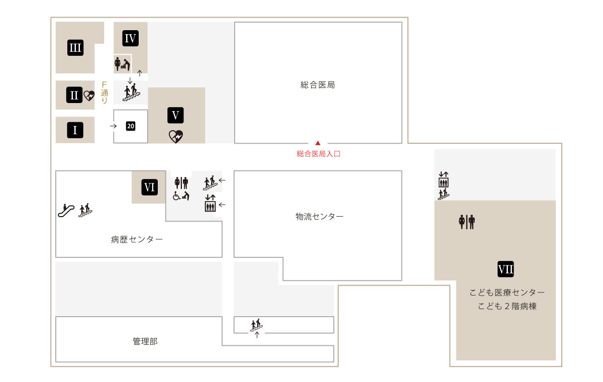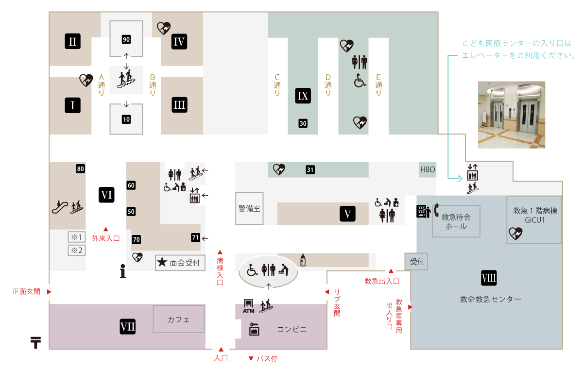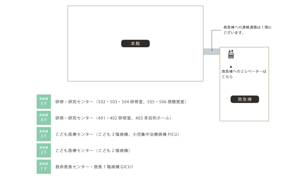 ※こども医療センターの入り口は「1階東側」のエレベーターまたは階段をご利用下さい。