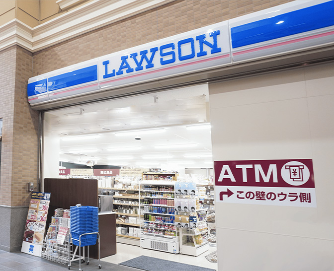 - 岡田珈琲(カフェ)ローソン(コンビニ)ATMコインロッカー郵便ポスト(正面玄関横)