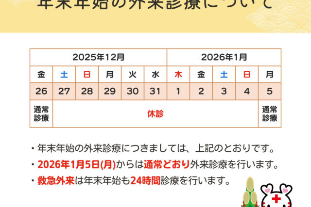- 年末年始の外来診療は2025年12月27日(土)〜2026年1月4日(日)までお休みいたします。 ※...